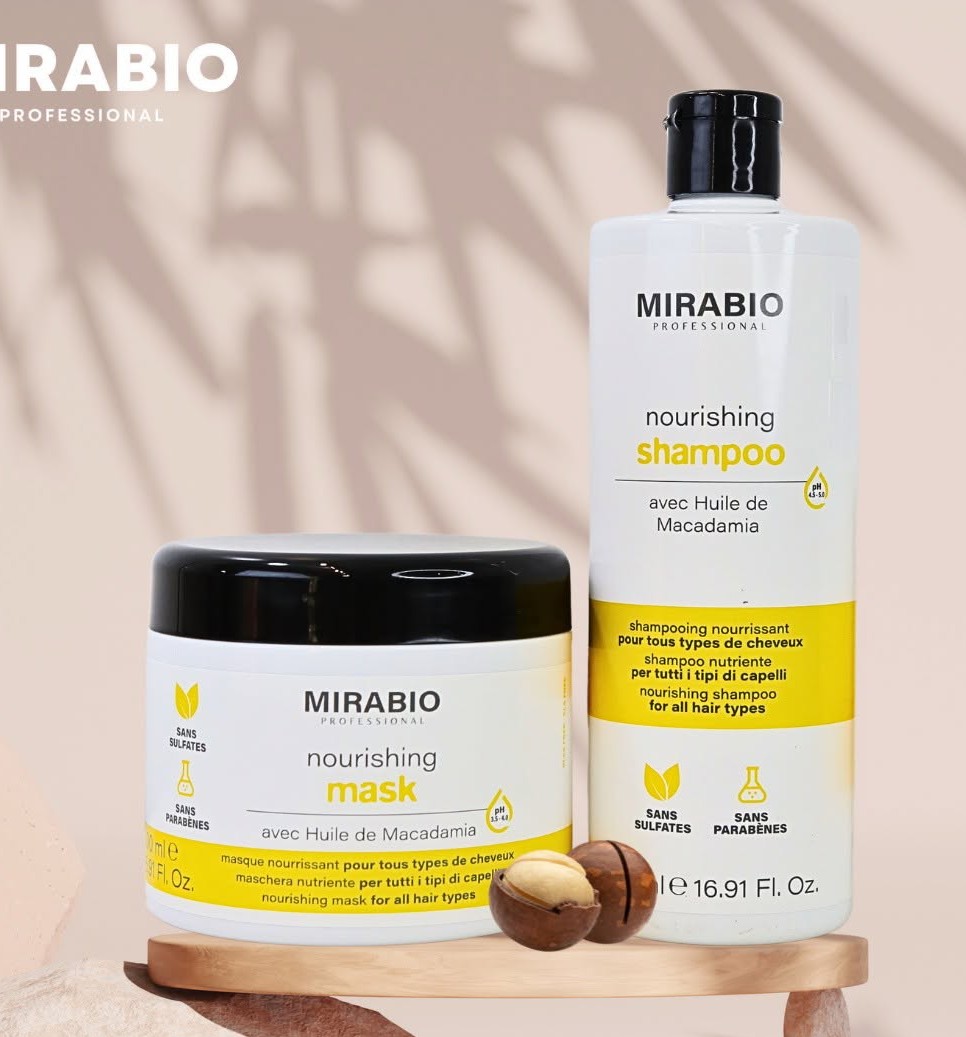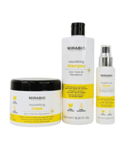 Kit 2-en-1 Mirabio (shampooing + masque + sérum) avec huile de macadamia.